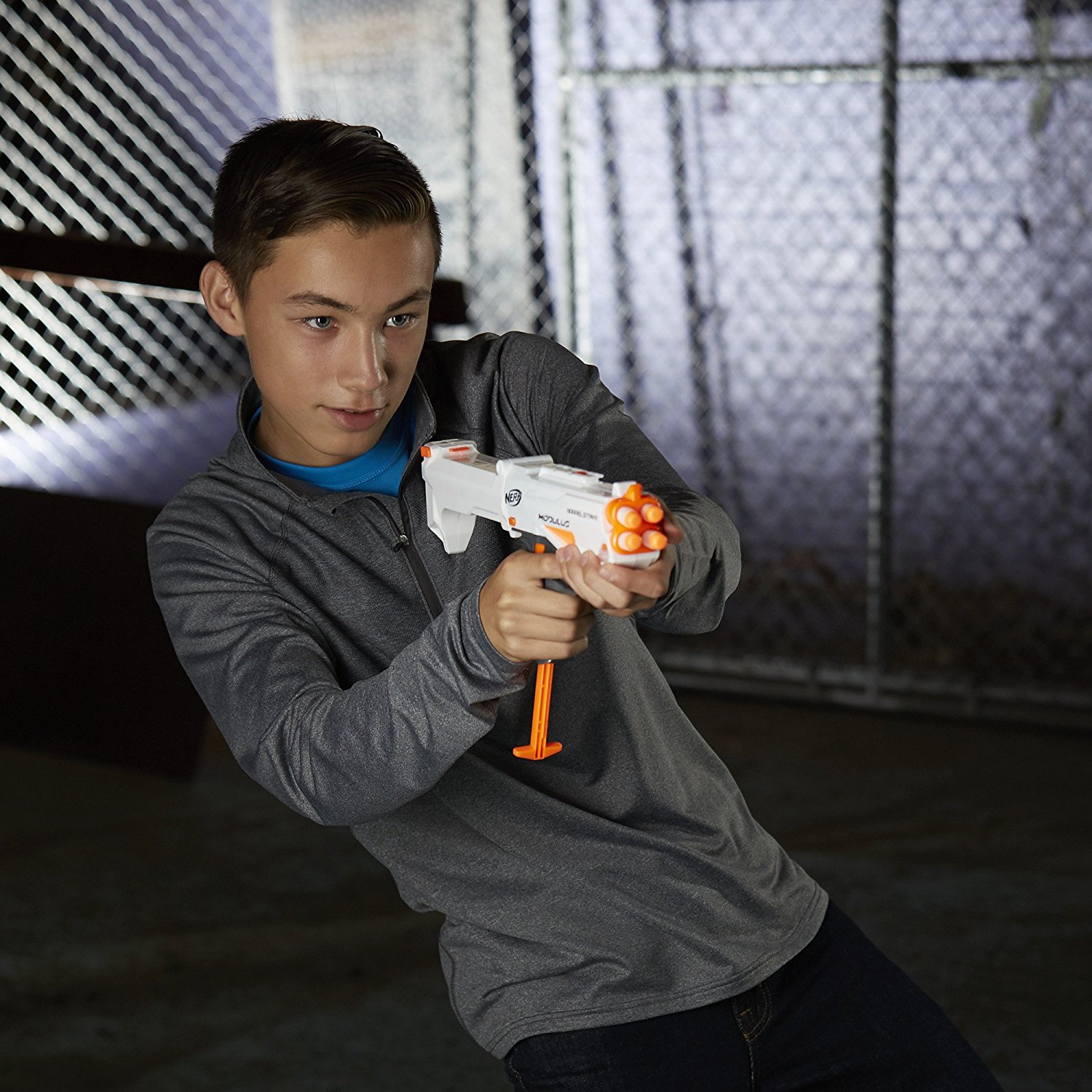 Nerf Нерф Модулус бластер аксессуар BarrelStrike (артикул C0389) представляет собой что-то среднее между полуавтоматическим пистолетом и космическим бластером для отражения атак пришельцев.