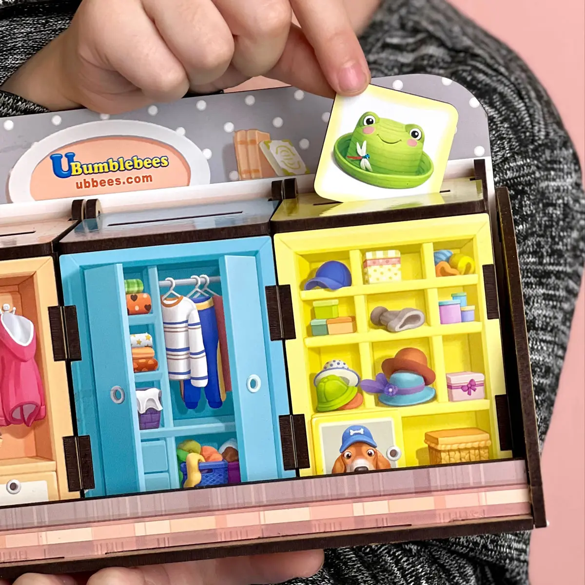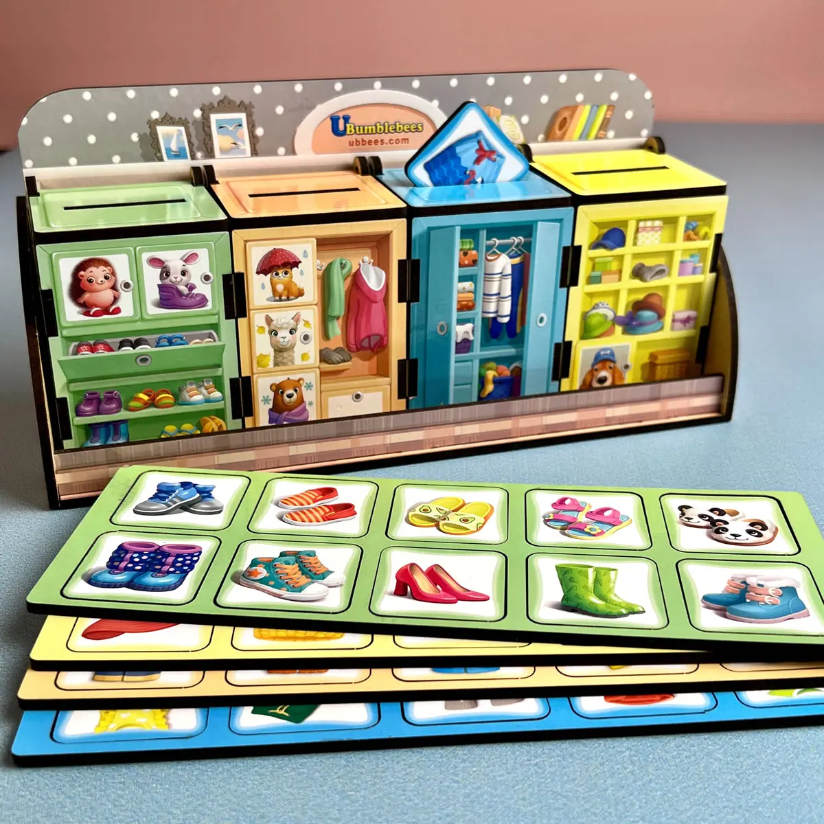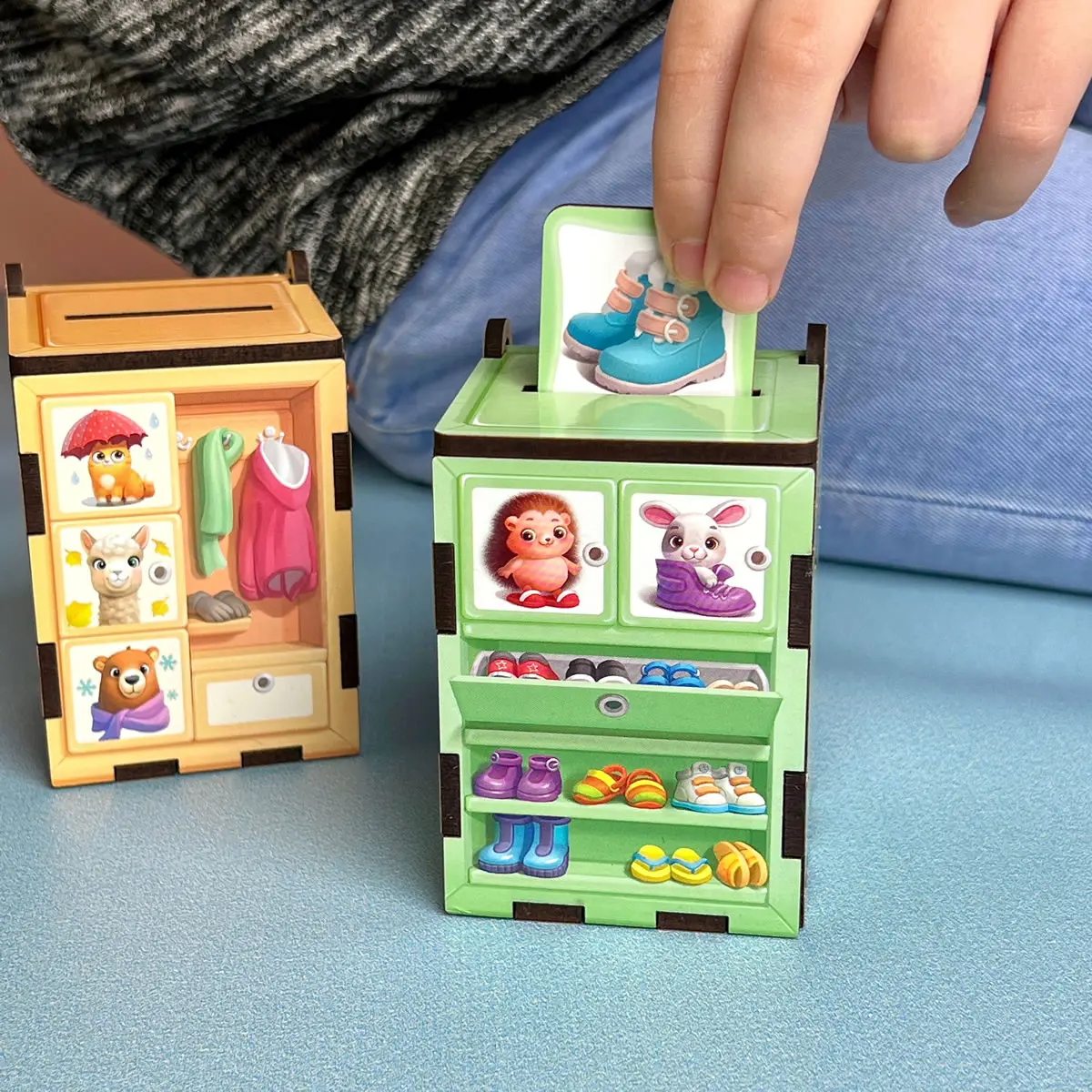ПодробнееКожна шафа призначена для певних речей: верхній одяг, головні убори, повсякденний одяг та взуття. У наборі йдуть 40 плашок із зображенням різних видів одягу та взуття, які необхідно правильно відсортувати по тематичним шафам. Плашками можна грати в гру "Меморі".
