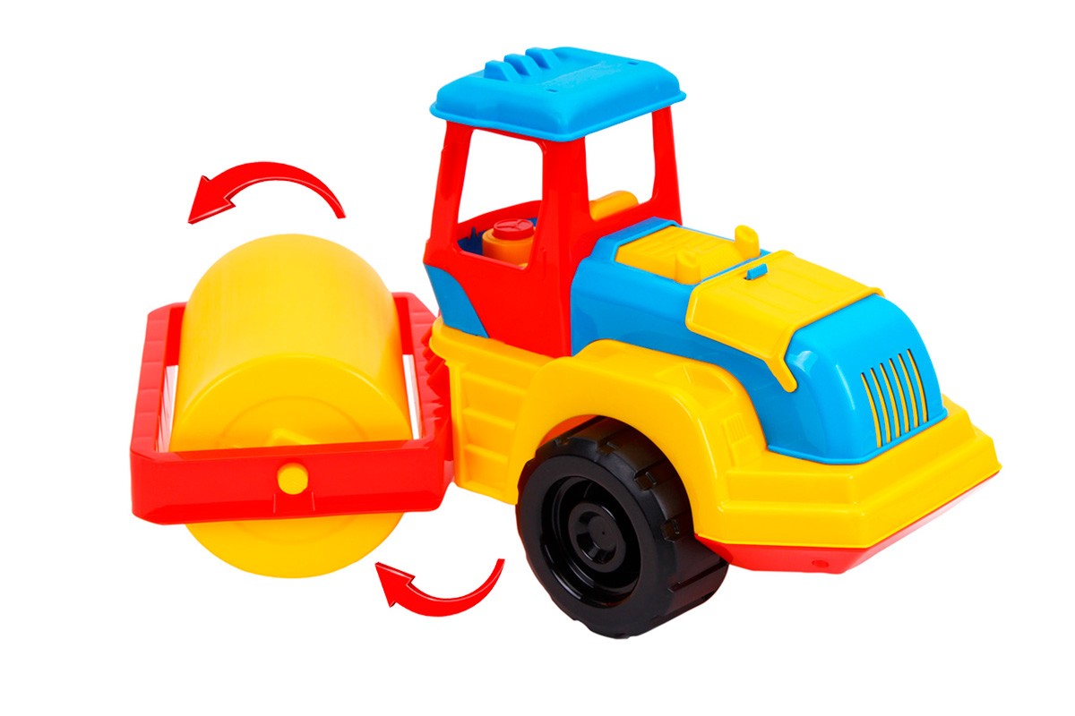 Особливістьнового трактора - рухоме (шарнірне) з'єднання кабіни з моторним відсіком і робочої частини (кріплення котка-вальця). Як і в сучасних машинах такого типу, наш коток може трамбувати асфальт не тільки на прямих ділянках автодоріг, а і на з'їздах з автобанів, заїздах у двори і працювати на невеликих площадках. Великі міцні колеса дозволяють машині долати різноманітні перешкоди. У комфортній відкритій кабіні зручно розміститься улюблена іграшка. Кришка моторного відділу відкривається і малюк зможе оглянути двигун та вчасно провести обслуговування або ремонт.