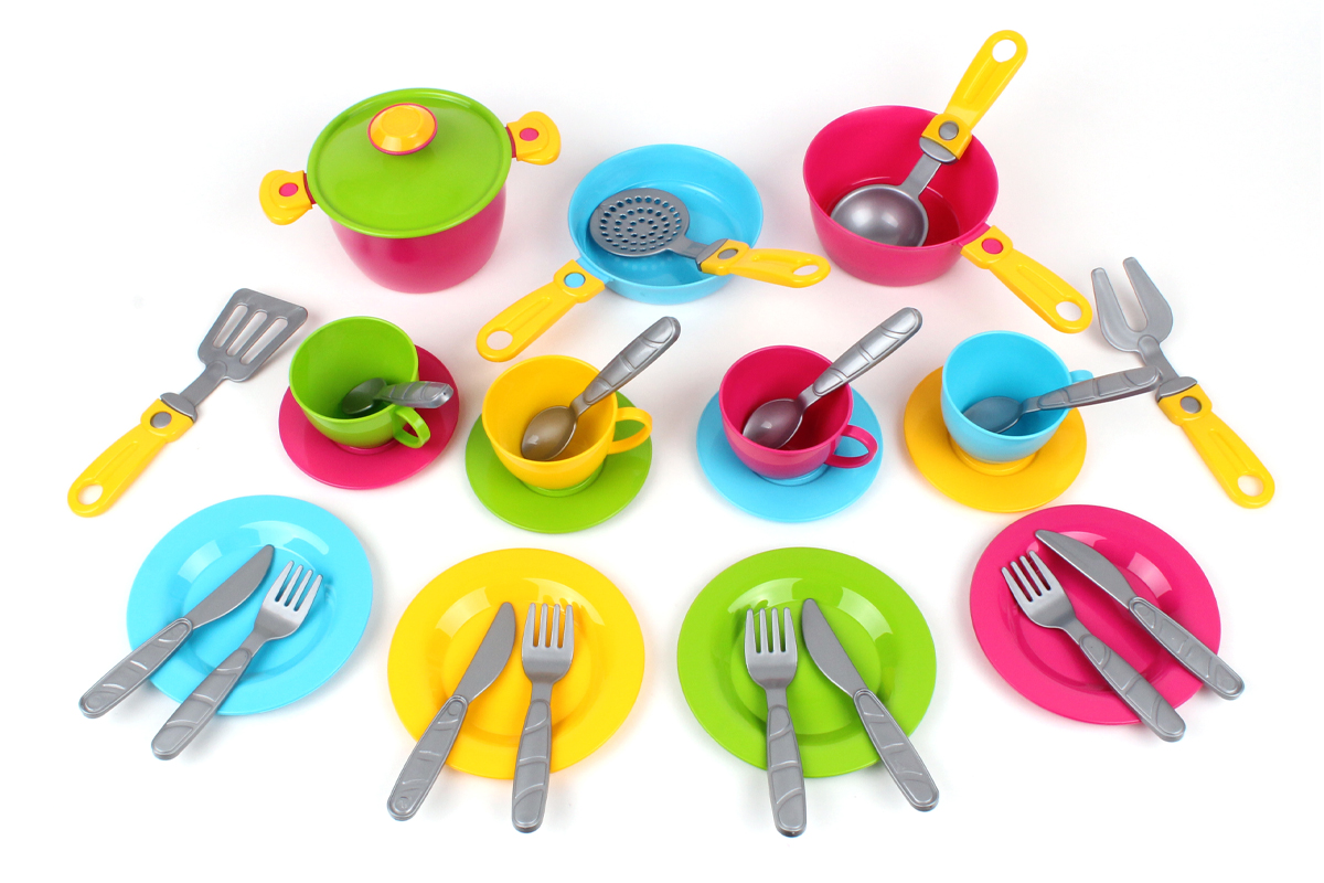 Яскраві кольори сподобаються малюкам, а різноманіття посуду викличе справжнє захоплення.У наборі є все, щоб маленька господинька реалізувала свої кулінарні задуми. Каструлька та сотейник для смачних борщів та корисних овочів, сковорідка для смаження. Шумівка, черпак, велика виделка та лопатка зроблять процес приготування максимально реалістичним. Також малеча зможе запросити друзів на чаювання з різнобарвними горнятками на блюдечках.Після смачного обіду – треба помити посуд. А як цікаво розкласти помитий посуд на сушці – це ж так само як робить матуся).Сюжетно-рольові ігри допоможуть Вашим діткам проявити гостинність, привчать дотримуватись порядку та бути акуратними.