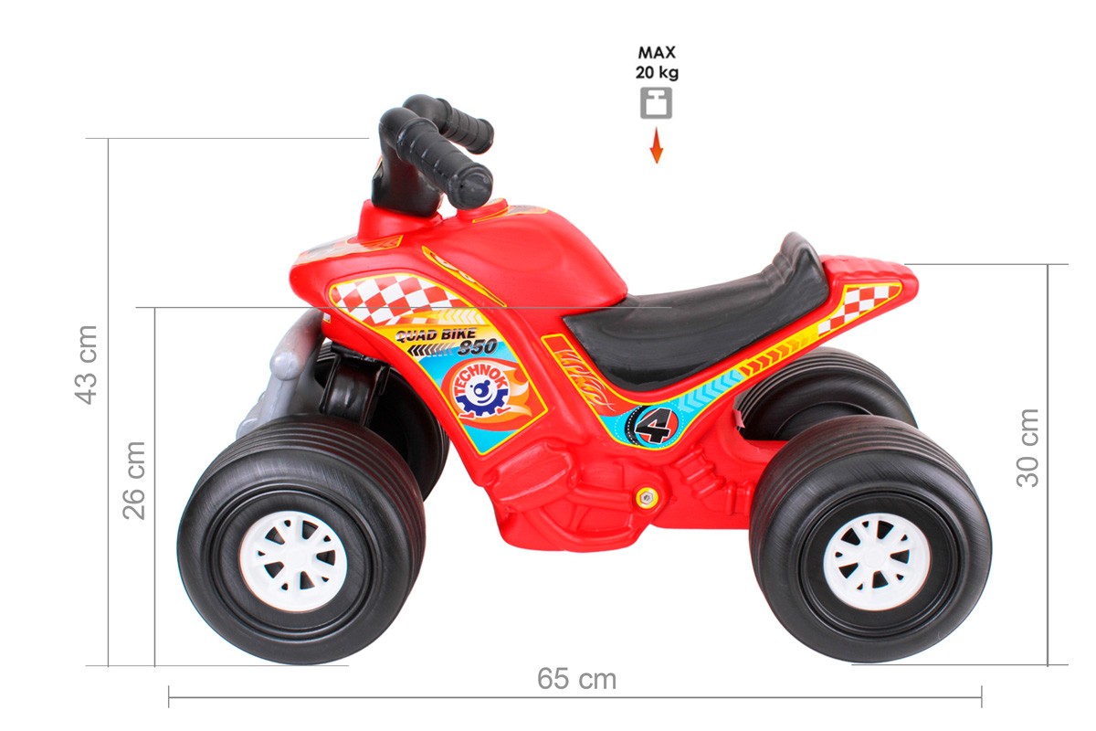 Міцні широкі колеса забезпечують стійкість та допоможуть малюкам подолати різні перепони на шляху. Іграшка підійде для ігор на дитячому майданчику та у парку. Катаючись на квадроциклі дитина розвиває координацію та фізичну витривалість.