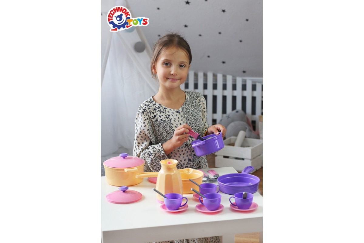 У наборі є все необхідне для приготування смачних страв та зустрічі гостей. Великі каструлі з кришками, сотейник з кришкою та сковорідка для втілення різноманітних кулінарних задумів. Шумівка, черпак та лопатка зроблять процес приготування максимально реалістичним. А щоб порадувати гостей запашною кавою – кавник з кришкою, 4 горнятка з ложечками на блюдечках.