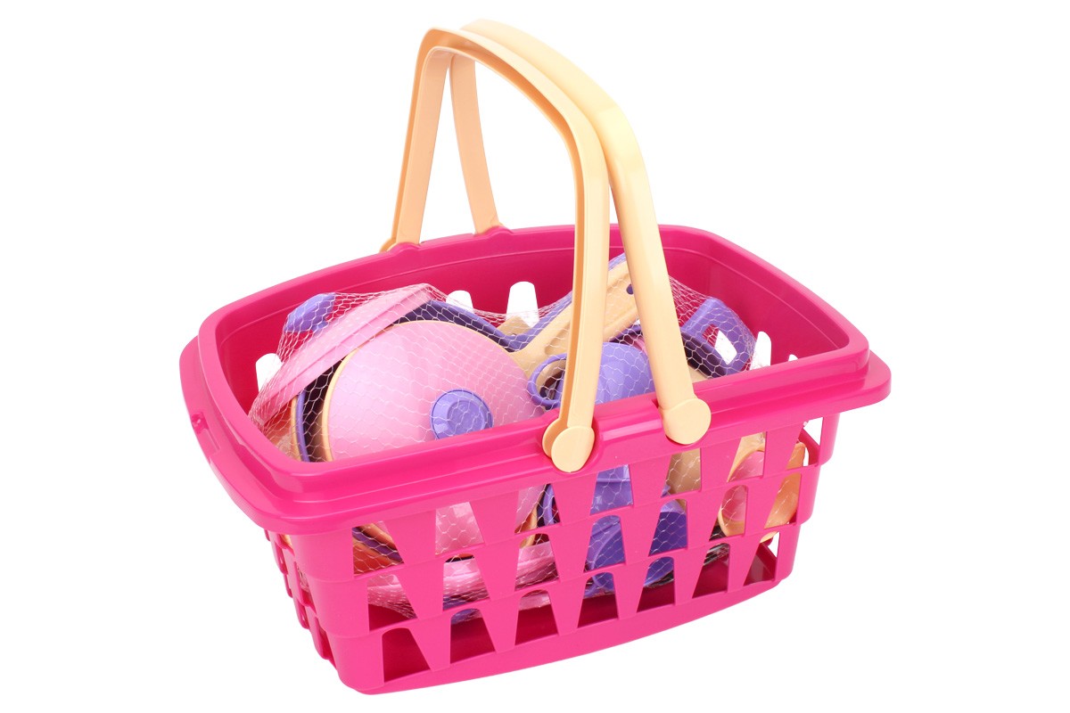 Всі іграшки розміщуються у великій корзині з двома ручками. Так посуд можна брати з собою на прогулянку і влаштувати справжній пікнік для друзів. Вдома ж іграшки зручно зібрати у кошичок та зберігати у дитячій кімнаті.