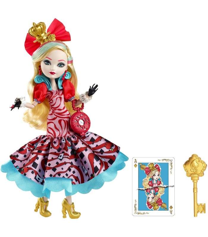 Кукла Эппл Вайт имеет длинные светлые волосы с голубыми и розовыми прядями. На голове есть красный бант с короной. Белоснежное личико естественно украшает легкий макияж. В глаза девушки можно действительно долго смотреть, так как они очень выразительные, голубого цвета. Одета кукла в длинное платье интересного покроя с красными воланами на руках и голубым подъюбником. Обута Эппл в золотистые туфельки, а на руках у нее черные перчаточки. У куклы есть сумочка в виде карманных часов.