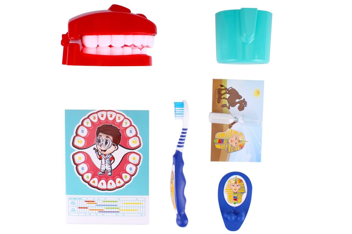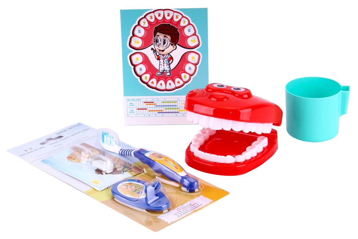 В наборе интересна игрушечная модель челюсти, на которой можно рассмотреть все зубки, их тщательно осмотреть и хорошо полечить. Как подсказка для родителей и детей схема роста зубов.