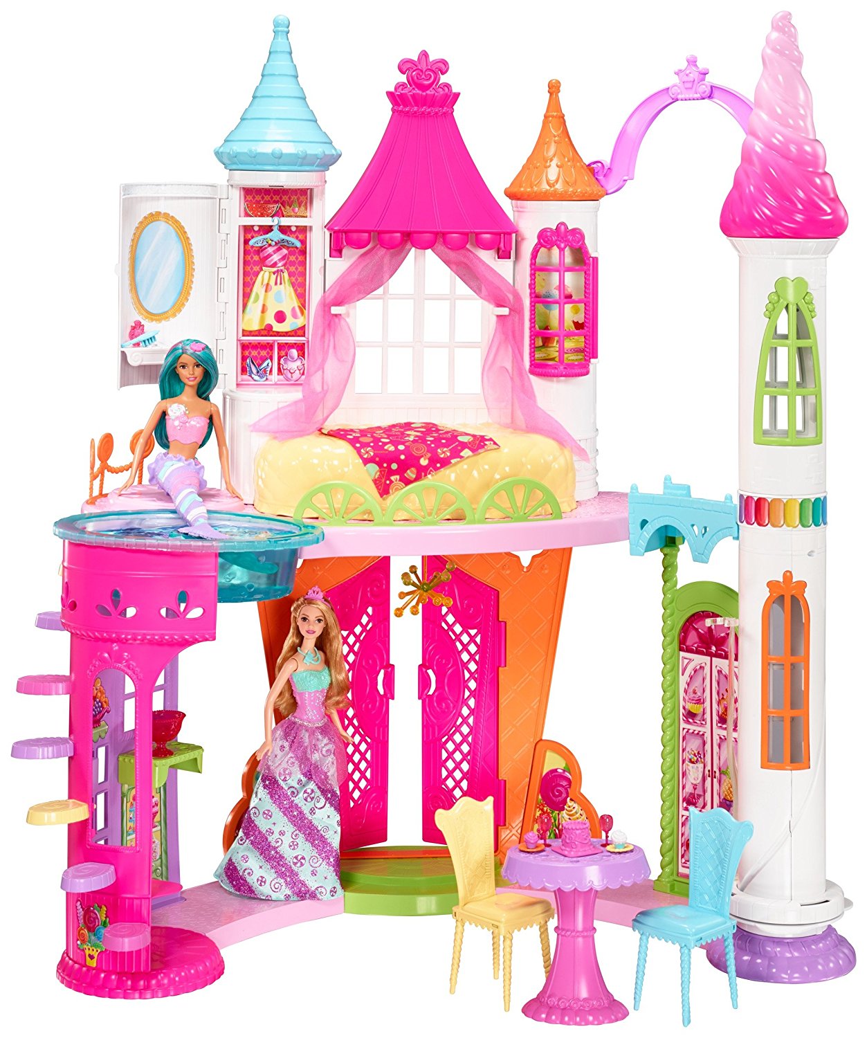 Конфетный замок barbie — это двухэтажный домик с множеством ярких башен, окон, дверей, в которых есть: