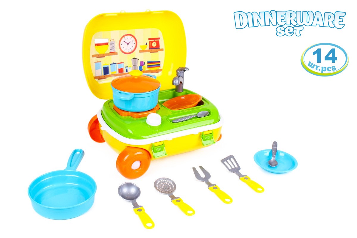 У наборі: валіза, стільниця кухонна, кран, велика каструля з кришкою, сковорідка, блибока тарілка - 2 шт, ложка 2шт, кухонне приладдя - 4шт.