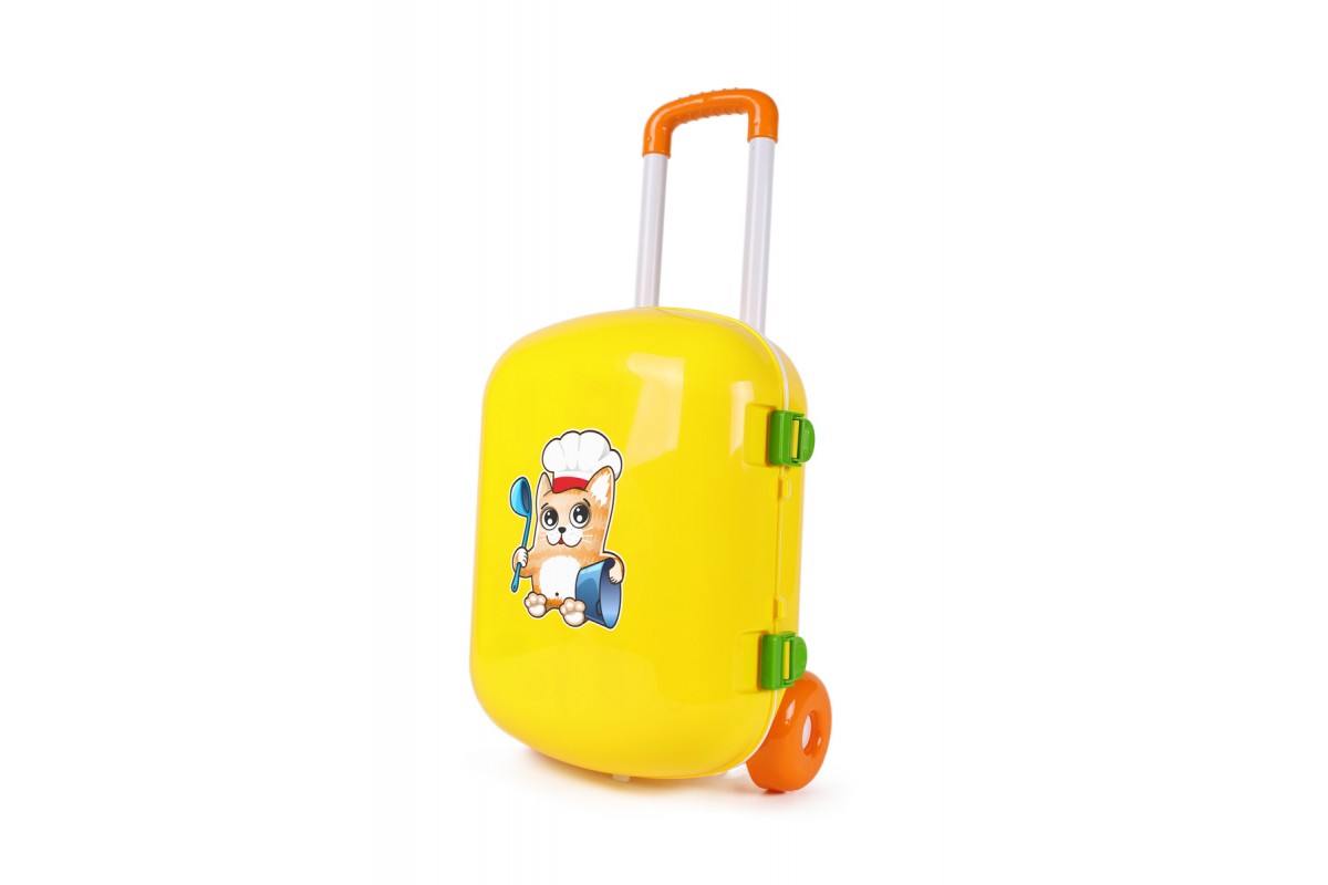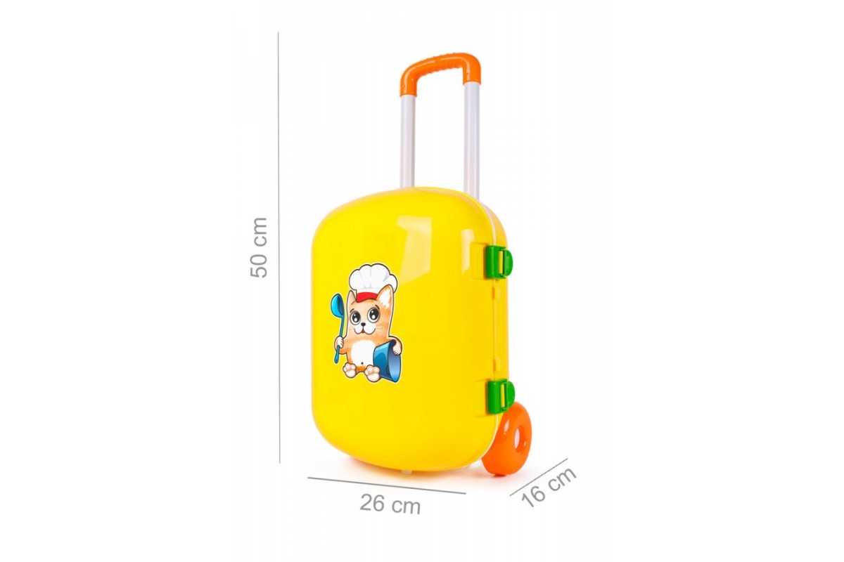 Завдяки великим міцним колесам, зручній ручці, що регулюється та надійним защіпкам, дитина зможе вільно перевозити кухонний набір у валізі.