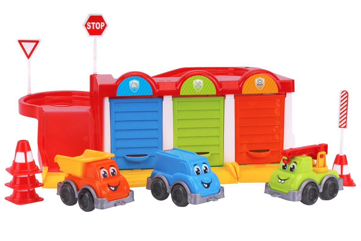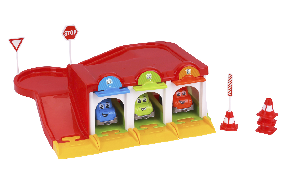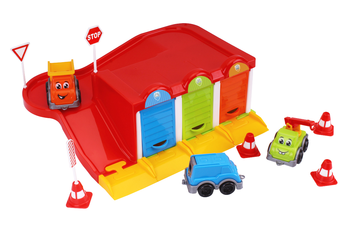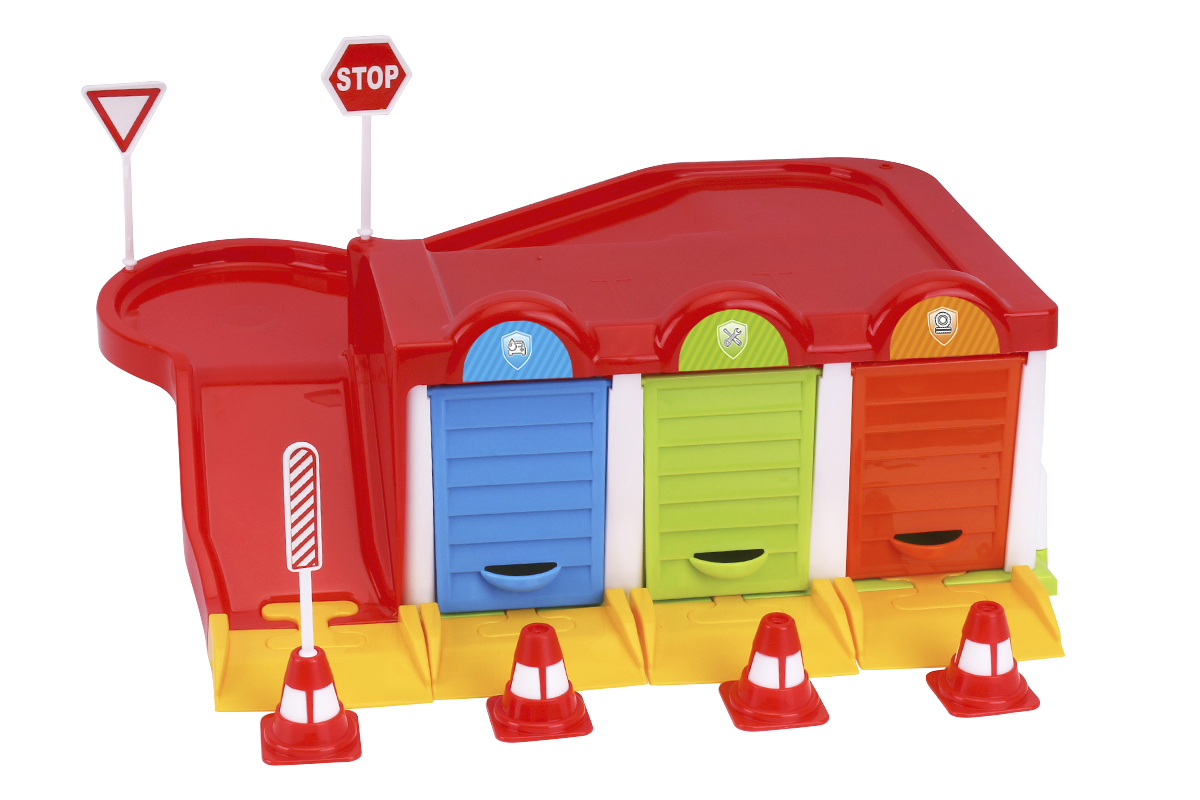 Бокси з тематичними наліпкаминад воротами та відповідним кольором дверей: автомийка, СТО, шиномонтаж. Великий дах з місцями для паркування, дорожніми знаками та спуском подарують малюкам години радісних забав.
