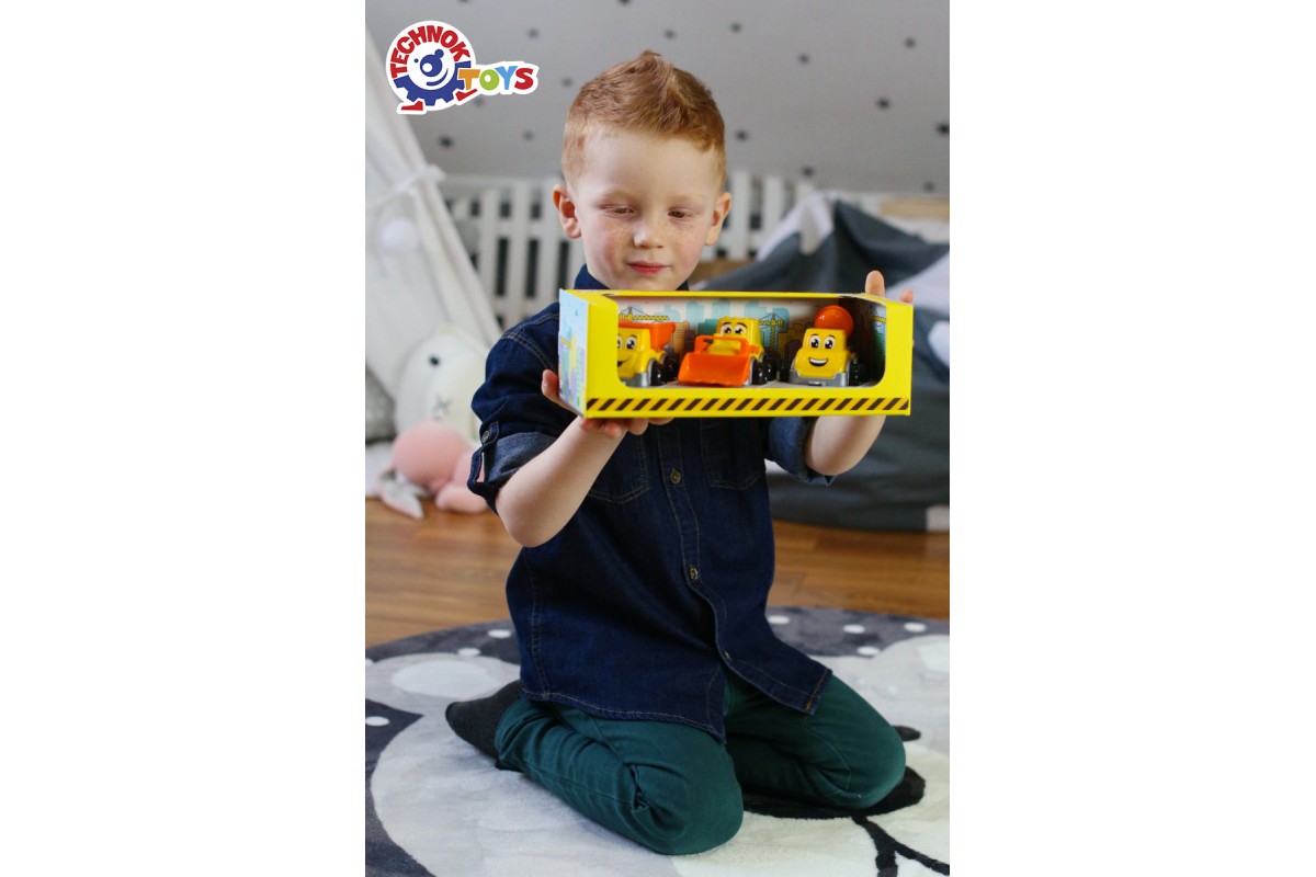 У наборі маленькі самоскид, трактор та автоміксер. З іграшками цікаво гратися у пісочниці та вдома. Можна будувати дороги, мости та будинки, перевозити вантажі, змішувати бетон чи копати траншеї. Такі ігри розвивають у малюків фантазію, уяву та мислення. Особливістю всіх машинок у наборі є оченята та посмішка, що нанесені методом «тамподруку». З такими емоціями іграшки перетворюються на казкових героїв і ніби оживають. Іграшковий набір будівельної спецтехніки має всі шанси стати найкращим другом вашої дитини. Запаковані машинки у яскраву подарункову коробку.