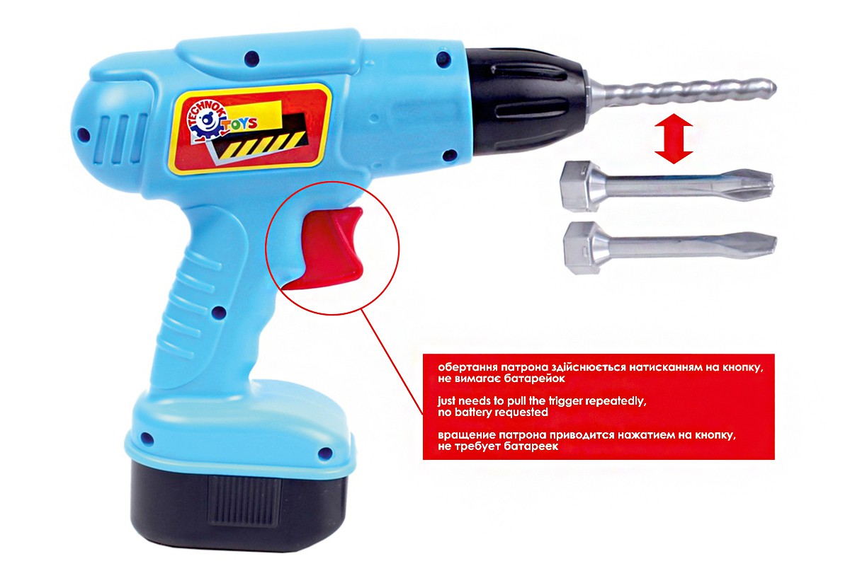 Обертання патрона дриля здійснюється за допомогою шестерневого механізму, який приводиться в рух пальцем дитини.
