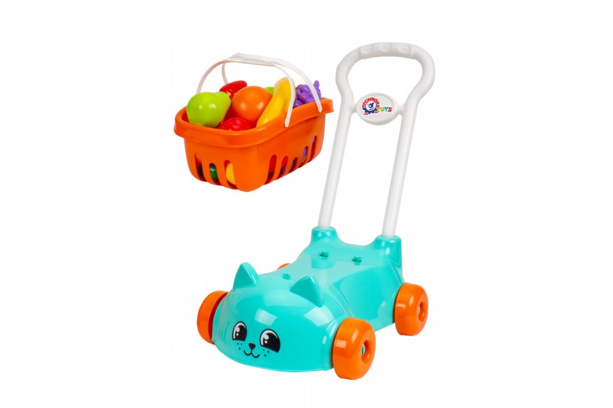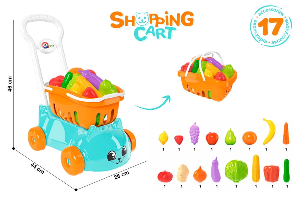 У наборі: візок з ручкою, кошик, 16 овочів та фруктів.