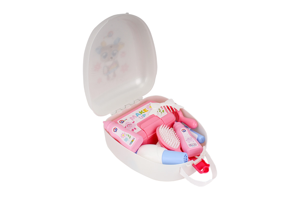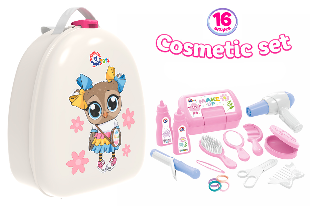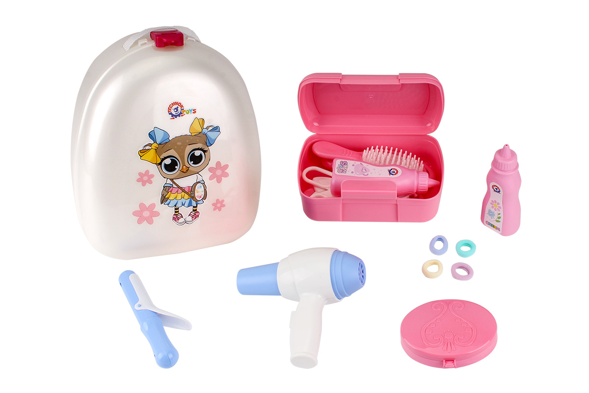 Комплектація: рюкзак, косметичка, плойка, фен, гребінець, щітка, дзеркало, ножиці, заколка гребінець, пудрениця, 4 резинки для волосся, 2 баночки з "кремом" і "шампунем", пінцет.