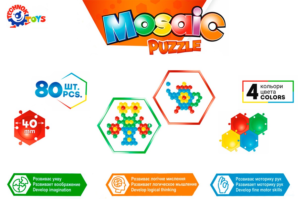 ПодробнееМозаїка-пазли складається з великих кольорових шестикутників (80 деталей), з яких малюк може скласти будь-які фігурки та візерунки.