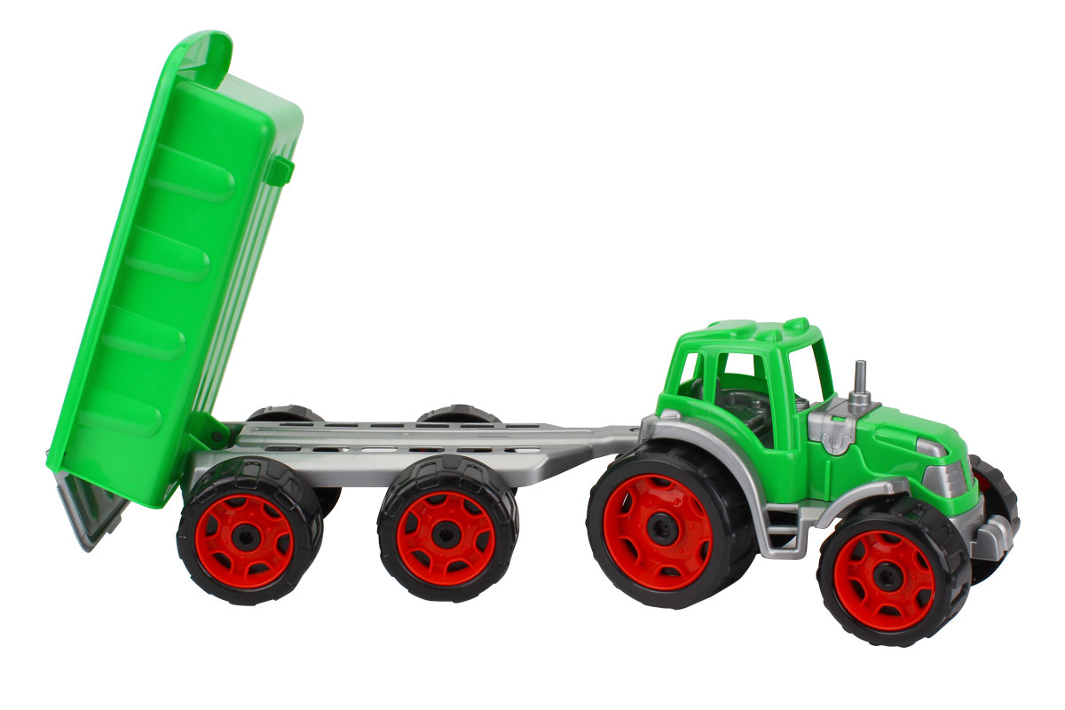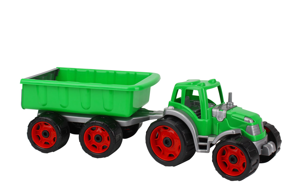 ПодробнееЯскравий пластиковий трактор з причепом ззаду.