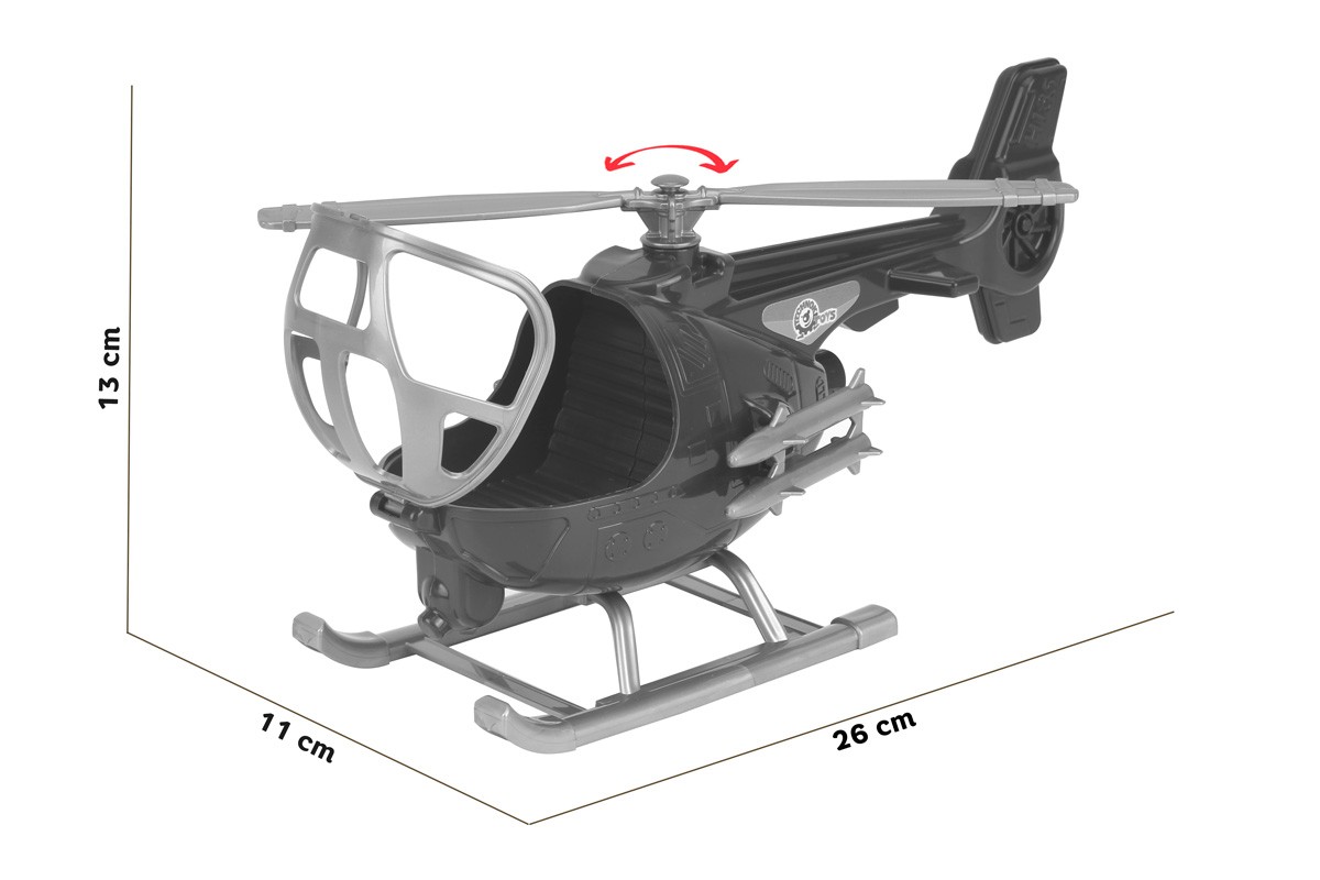 Швидкій та маневровий гелікоптер від ТехноК входять до складу військово-повітряних сил. Потужний гвинт та великі шасі надають іграшці стійкості. До фюзеляжу військового гелікоптеру прикріплені ракети. Кабіна відкривається, в ній зручно розмістити фігурку пілота або улюблену іграшку. Гелікоптер оздоблений яскравою патріотичною наліпкою.