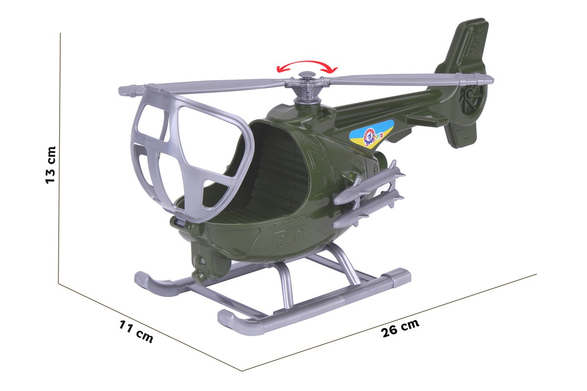Швидкій та маневровий гелікоптер від ТехноК входять до складу військово-повітряних сил. Потужний гвинт та великі шасі надають іграшці стійкості. До фюзеляжу військового гелікоптеру прикріплені ракети. Кабіна відкривається, в ній зручно розмістити фігурку пілота або улюблену іграшку. Гелікоптер оздоблений яскравою патріотичною наліпкою.