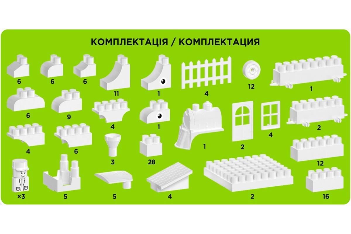 У наборі 170 цікавих різноманітних деталей яскравих класичних кольорів.Цеглини різних розмірів, віконця, двері та парканці для будівництва будиночків та замків. Набір дорожніх знаків, фігури машинок та літака стануть у пригоді для ігор з гаражами та паркінгами.Платформи з колесами– взагалі знахідка. Можна збудувати автомобіль, потяг чи літак. А ще платформа стане в пригоді при конструюванні роботів.Конструктор відповідає всім вимогам безпеки,в елементів відсутні гострі краї та сторонній запах. Деталі мають яскравий колір, що не залишається на дитячих пальчиках. Цеглини приємні на дотик, легко складаються, водночас зібрана конструкція міцна та тримає форму.Кольорова покрокова інструкція є необхідністю, особливо коли дитина знайомиться з конструктором. Збираючи моделі згідно з інструкцією, малюки досліджують можливості конструктора та вивчають ази побудови базових фігур.Чим все ж таки корисні ігри з конструктором? Головна перевага цієї іграшки — це розвиток важливих навичок для повноцінного розвитку дітей.Для дітей віком від 3-х років.
