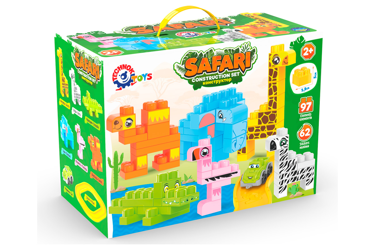 Жираф, фламінго, крокодил, слон, верблюд та зебра - кожна з цих чудових тварин може оживати в руках вашої дитини. Чудова можливість розкрити свою творчість та фантазію в процесі складання. Додатково до конструктора надаються 62 наліпки, які допомагають надати тваринкам виразності та реалізму. Це відмінна можливість навчитися деталізації та навіть обрати свою найулюбленішу тваринку. Але гра з конструктором не закінчується лише складанням тваринок. В наборі також міститься дорога і позашляховик, що дає змогу створити різноманітні сценарії гри. Маленькі дослідники можуть вирушити в екзотичну подорож по африканському континенту і познайомитись зі світом тварин.