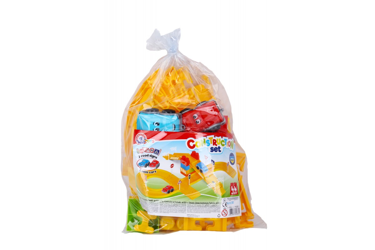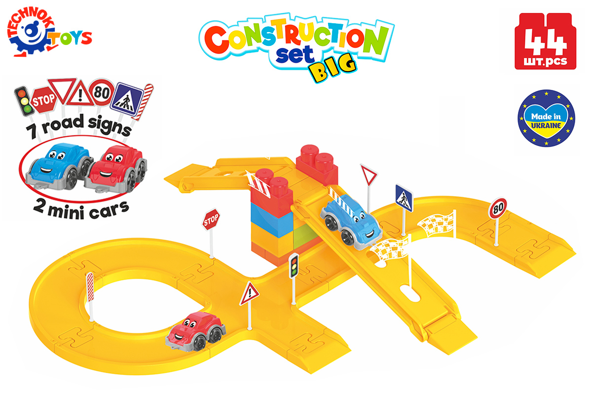 Іграшка "Конструктор ТехноК"– це 44 елементи, серед яких траси з перехрестями та поворотами, спуски, дорожні знаки та 2 машинки. Будівельні цеглини великі та зручні для маленьких діточок.