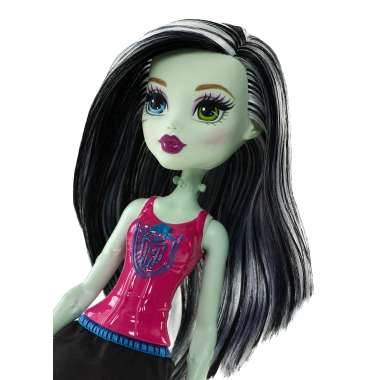 Кукла Френки Штейн изготовлена из нетоксичных и гипоаллергенных материалов, безопасных для здоровья. У куклы длинные, черно-белые волосы. В этой кукле нет челки. На лице у красавицы есть шрам. Макияж красавицы выполнен в розовом цвете. Глаза куклы, как и у персонажа один зеленого цвета, а другой голубого. Руки у куклы не сгибаются, двигаются только в части плеча. На кукле одето платье. Верхняя часть платья сделана из пластика розового цвета с логотипом Monster High, а нижняя из ткани черного цвета. На ногах у куклы обуты голубые туфельки. Ноги также не сгибаются, двигаются только в верхней части ноги.