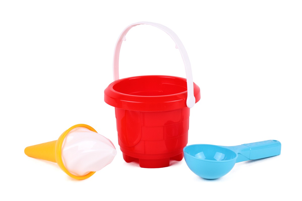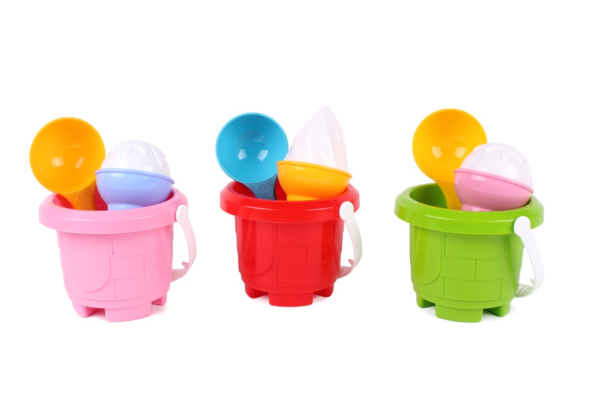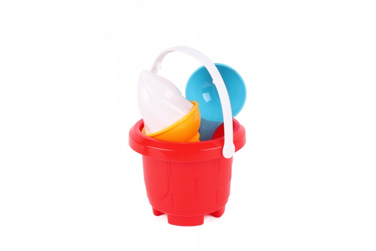 У наборі кругле відерко, дизайн якого імітує кладку середньовічної вежі, цікава формочка для піску у вигляді ріжка морозива з вершечком та ложечка. Відерко можна також використати як формочку для піску і збудувати справжні великі вежі.Ручка відерка м’яка та еластична, не містить дрібних деталей, а тому іграшка є безпечної для діток від 1 року. Розмір відра спеціально розрахований для зручного використання маленькими дітками. Така іграшка не займе багато місця у візочку або сумці, її завжди можна взяти з собою на прогулянку.Для дітей від 1 року. Запакований у сіточку.