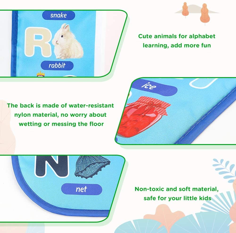 Коврик украшен буквами, цифрами, животными и фруктами. Это интересный способ попрактиковаться в распознавании алфавита и чисел.