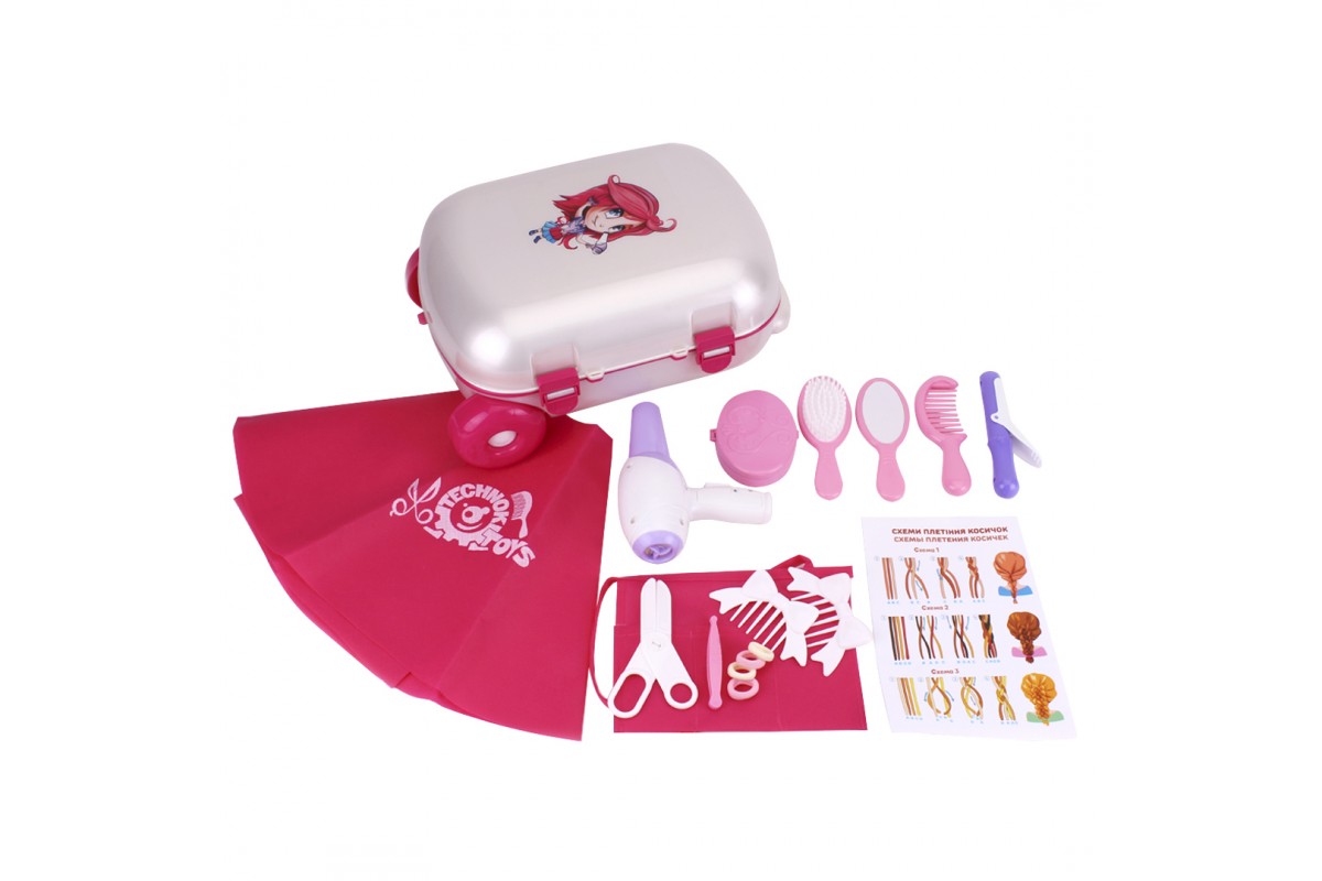 Комплектація: валіза, фен, плойка, гребінець, щітка, дзеркальце, 2 заколки, пудрениця, пінцет, ножиці, накидка, пояс, 4 резинки для волосся, інструкція для заплітання.