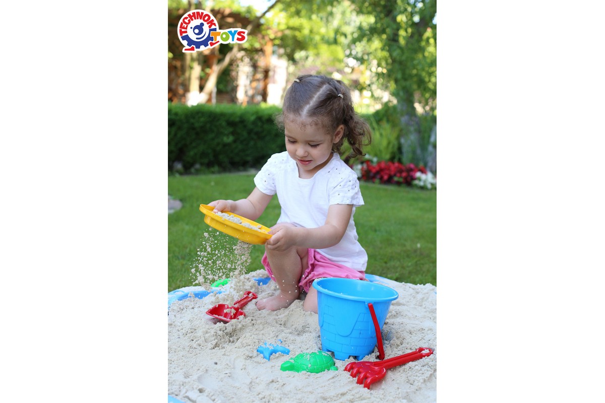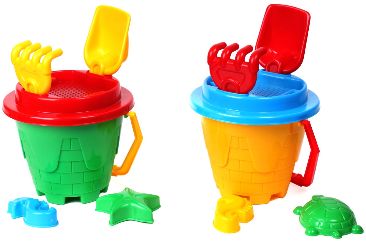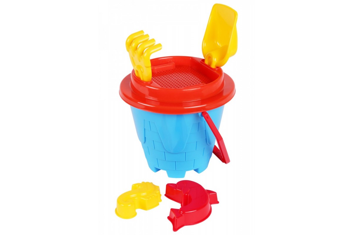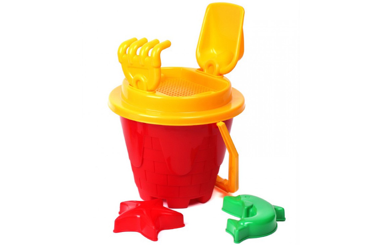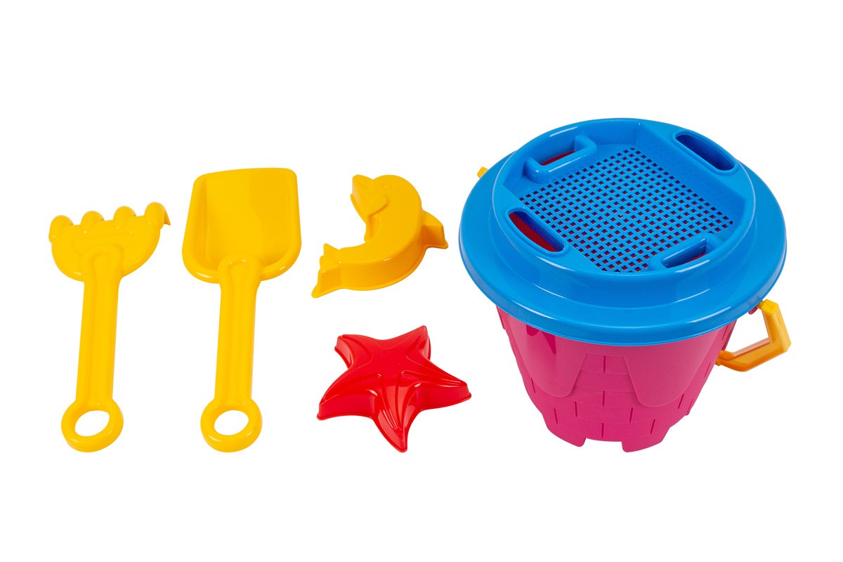 В ситі - 2 додаткові отвори для зручного носіння грабельок та лопатки. Відерко може бути в наступних кольорах: червоний, жовтий, темно-блакитний, зелений, яскраво-рожевий. Формочки у вигляді морських тваринок (черепаза, дельфін, морська зірка, морський коник у кольорах червоний, жовтий, зелений, темно-блакитний).Ідеальний набір для гри у теплу пору року.