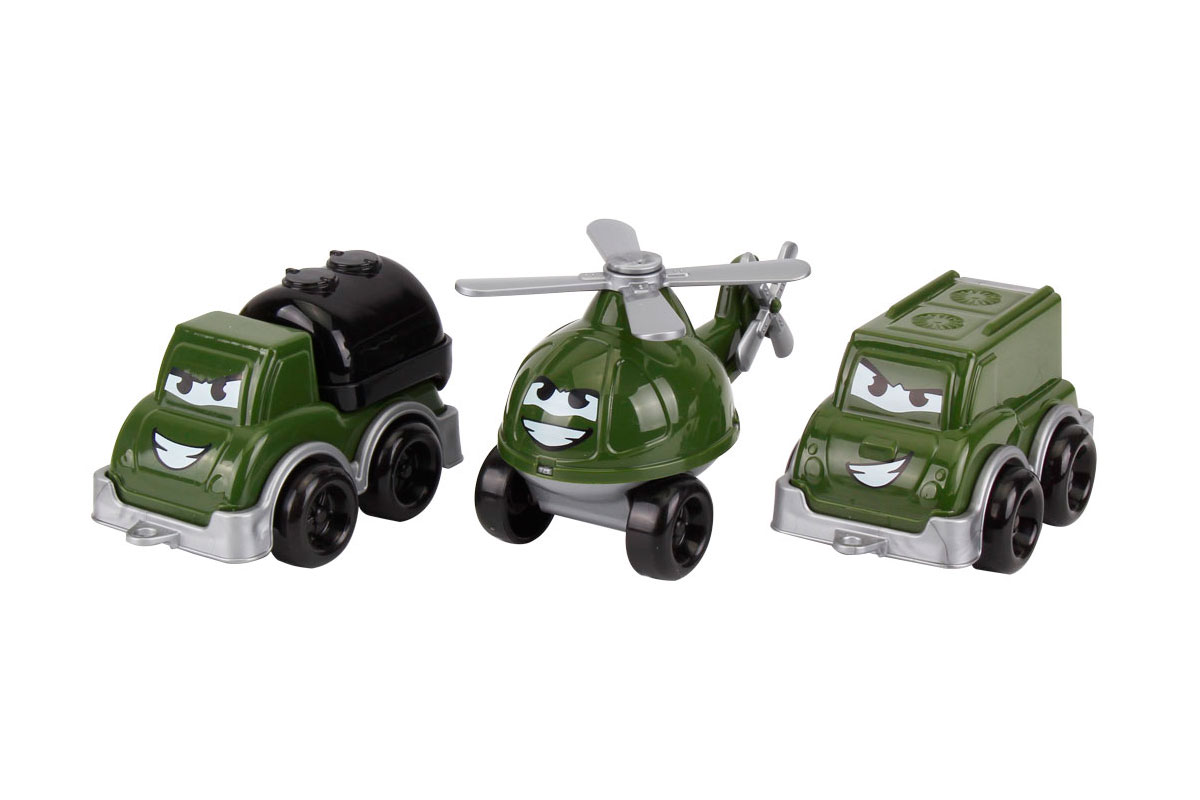 У наборі маленькі бензовоз, гвинтокрил і мікроавтобус. З іграшками цікаво гратися у пісочниці та вдома. Можна відвойовувати території, захищати будівлі та нападати на ворога.