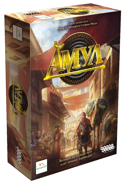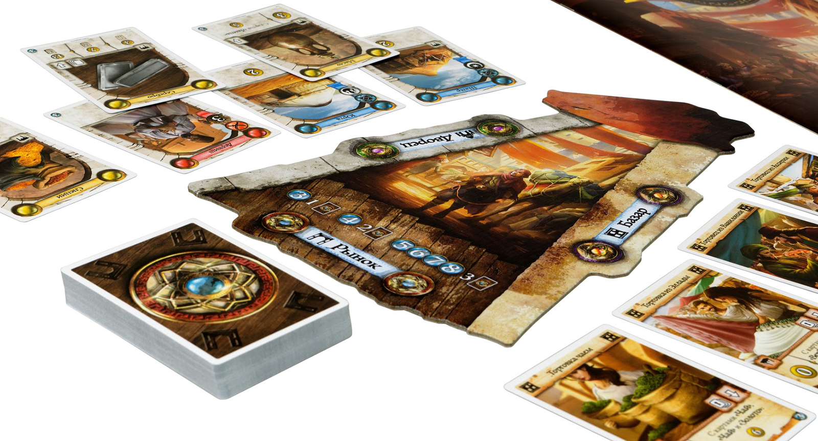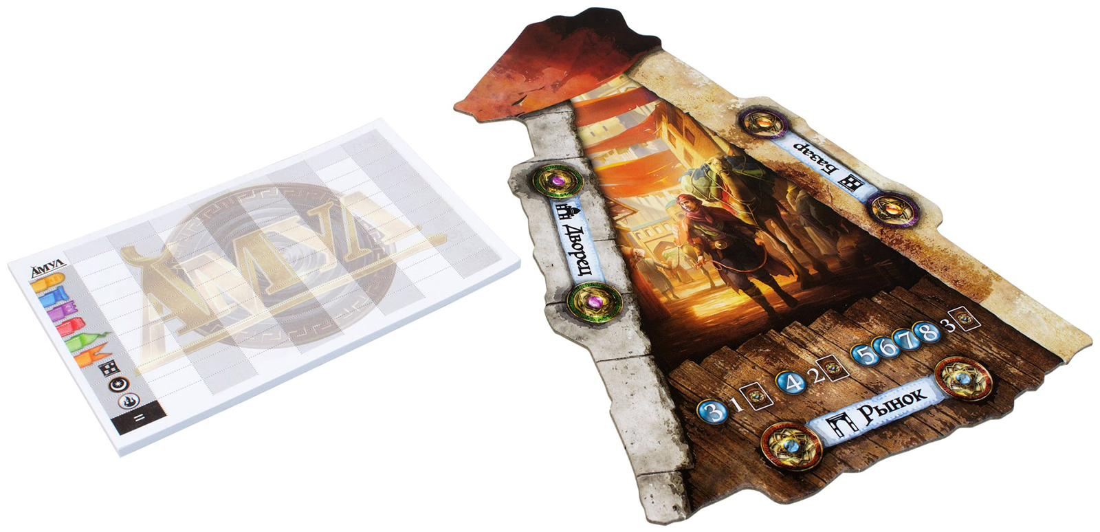 Рядом с планшетом городской площади выкладываются карты дворца и базара, а также колода карт рынка. Каждый торговец получает по 5 карт рынка на руку. Наше пребывание в Амуле продлится 9 раундов.