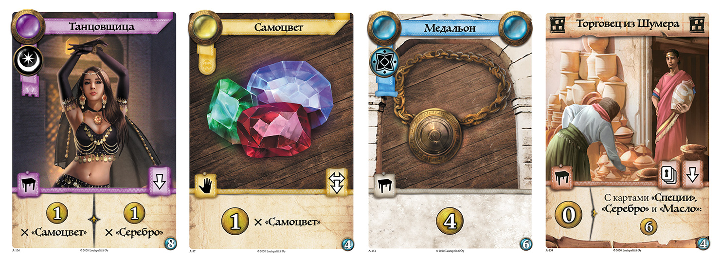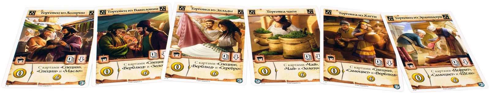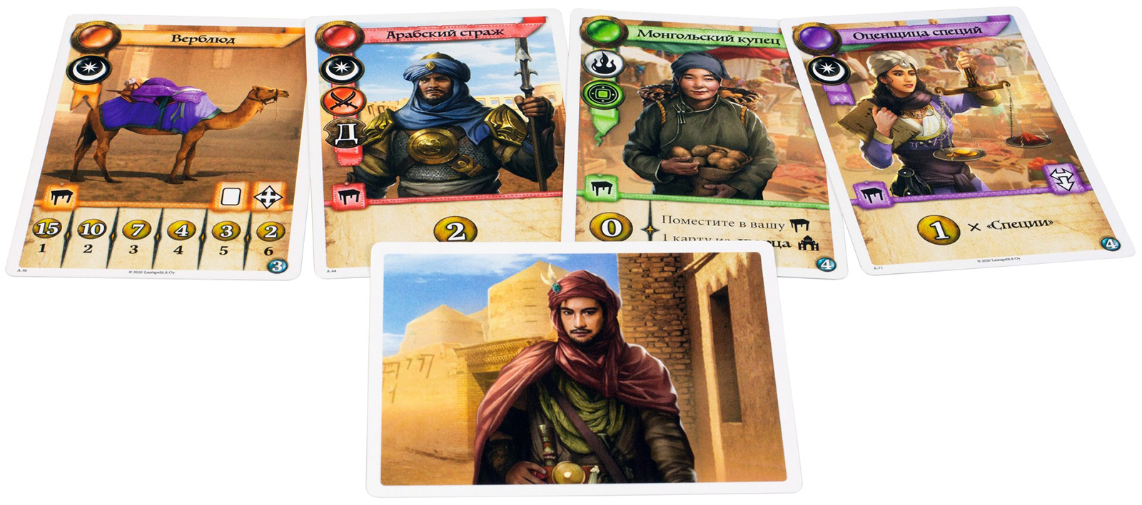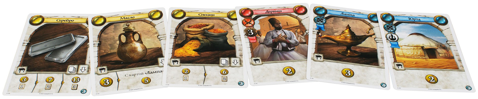 Карты приносят очки престижа – приятно получить золотую лампу, в которой согласно легендам обитают джинны. Баллы также начисляются за наборы одинаковых карт: чем больше персидских ковров, тем лучше! Случается, что одни карты требуют наличия других. Где есть куртизанка, там обязательно должны быть золото и шелка. ПО также приносят арабские и монгольские символы на картах. Некоторые карты отнимают очки: будьте острожны, общаясь с людьми сомнительной репутации.
