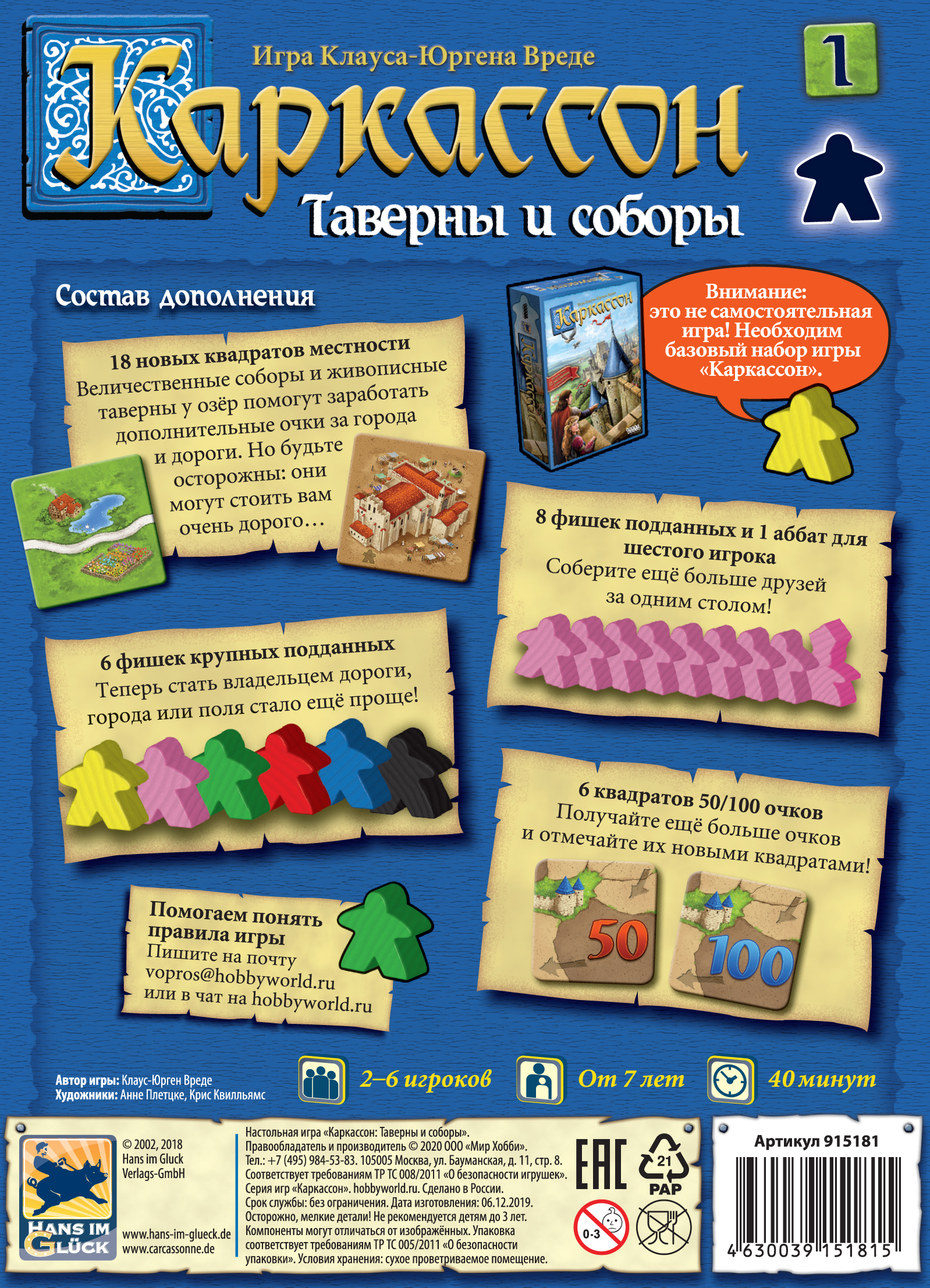 Поголовье миплов продолжает расти. Каждый игрок получает одного большого мипла, который заменяет двух маленьких. Возле дорог появляются таверны, а за стенами городов поднимаются соборы. Завершенные дороги с тавернами и города с соборами приносят больше очков. В общем, только успевай подсчитывать ПО. Чтобы облегчить вам эту приятную задачу, в игру были добавлены счетные квадраты по 50/100 очков.