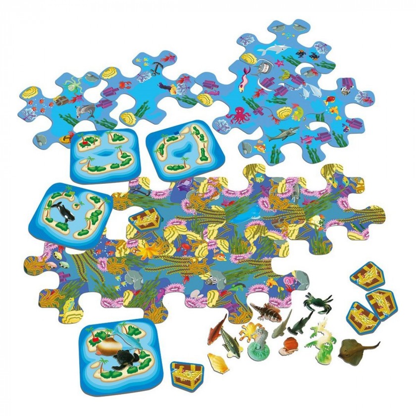 Перед началом игры, нужно в первую очередь определиться, на какой стороне игрового поля мы будем играть, и собрать его из отдельных пазликов. Одна сторона нашего рифа густо покрыта водорослями, поэтому отыскать спрятавшихся там рыбок будет немножко сложнее. Для первой партии или для игры с малышами выбирайте «безрастительную» сторону, а когда изучите ее вдоль и поперек, можно будет перейти к усложненному режиму.
