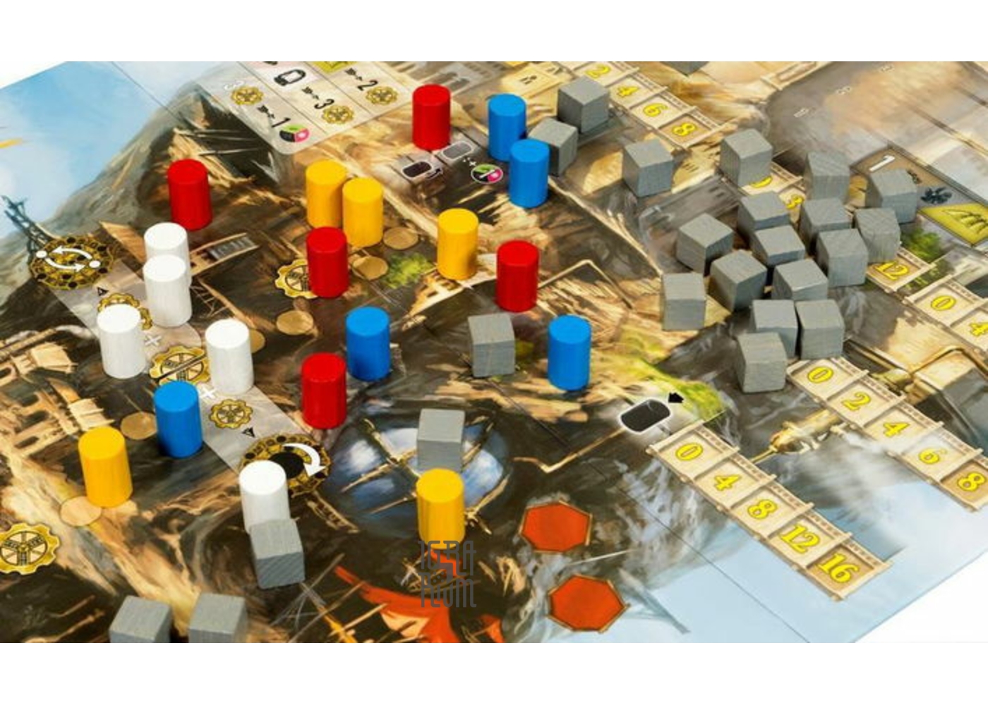 Каждый игрок получает хитроумный механизм, состоящий из трех колес разного диаметра с делениями для дисков. Вначале на колеса определенным образом выкладываются диски города, путешествия и инструментов. Все диски выкладываются одноцветной стороной вверх. Далее каждый игрок должен выложить по одному диску каждого ресурса уникальным образом. В определенную фазу хода игрок может применять эффекты дисков, находящихся в активной части колеса.