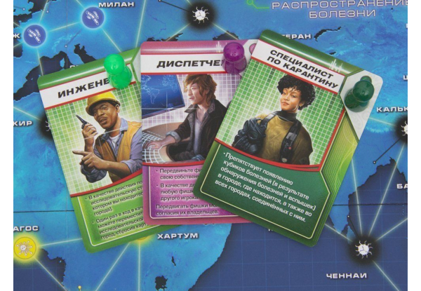 Раскладываем игровое поле, которое представляет из себя карту мира с городами. Согласно правилам игры, в некоторых городах раскладываем кубики болезней. В специально отведенные места на поле, кладем маркер вспышек вирусов, маркер распространения болезней, колоду карт болезней, а также жизненно необходимые пробирки с лекарствами. Каждый игрок получает памятку и случайную роль в игре: врач, диспетчер, ученый, специалист по карантину, исследователь, инженер и эксперт по чрезвычайным ситуациям. Каждая роль обладает своими, уникальными особенностями. Все участники научно-спасательной экспедиции отправляется на старт: в первую исследовательскую станцию в городе Атланта (США).