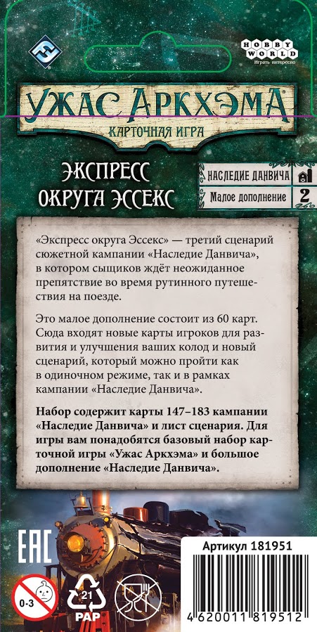 Настольная игра Ужас Аркхэма Карточная игра: Наследие Данвича Экспресс округа Эссекс дополнение Arkham Horror. The Card Game: The Dunwich Legacy. Essex County Express