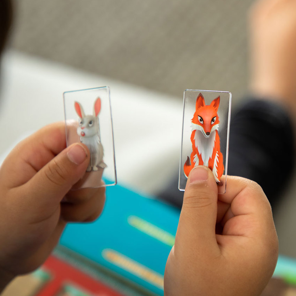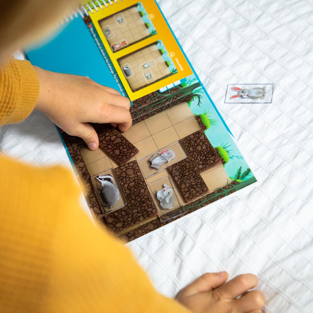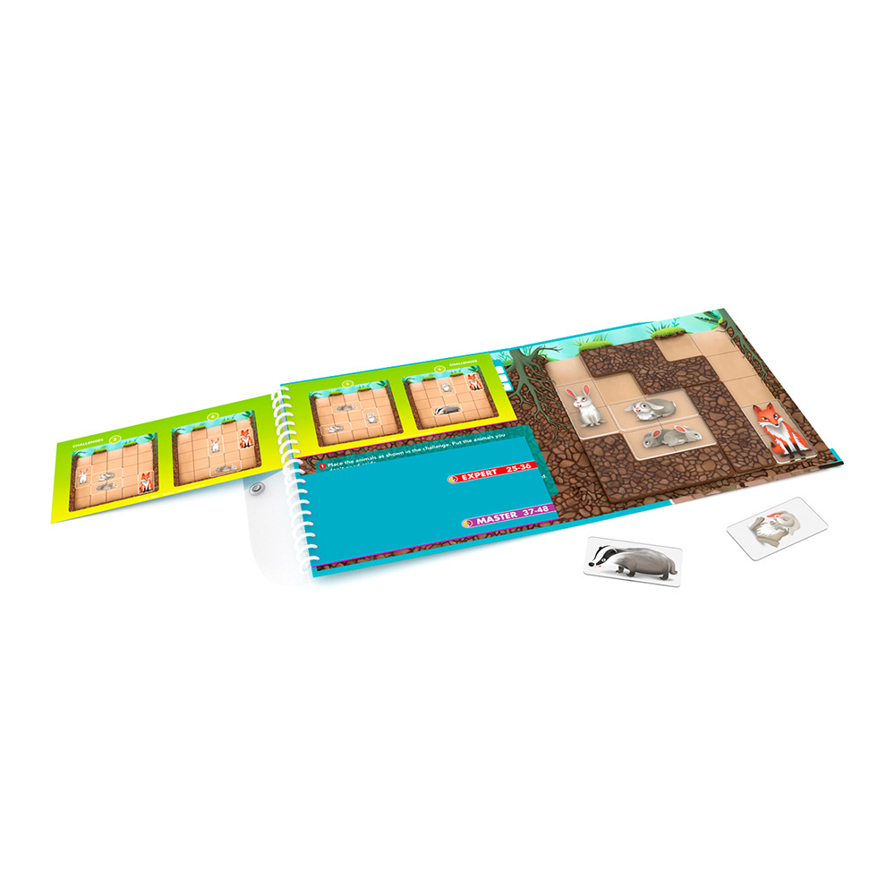 Перед вами магнитная игра-головоломка, которую можно брать в дорогу. Раскрыв блокнот, вы увидите игровое поле, где мы будем рыть норки для животных, и странички заданий. В набор входят 9 фрагментов головоломки, которые крепятся к полю с помощью магнитов: 3 квадрата земли, 4 зайчика, барсук и лисичка. Зверушки нарисованы на прозрачных плашках.