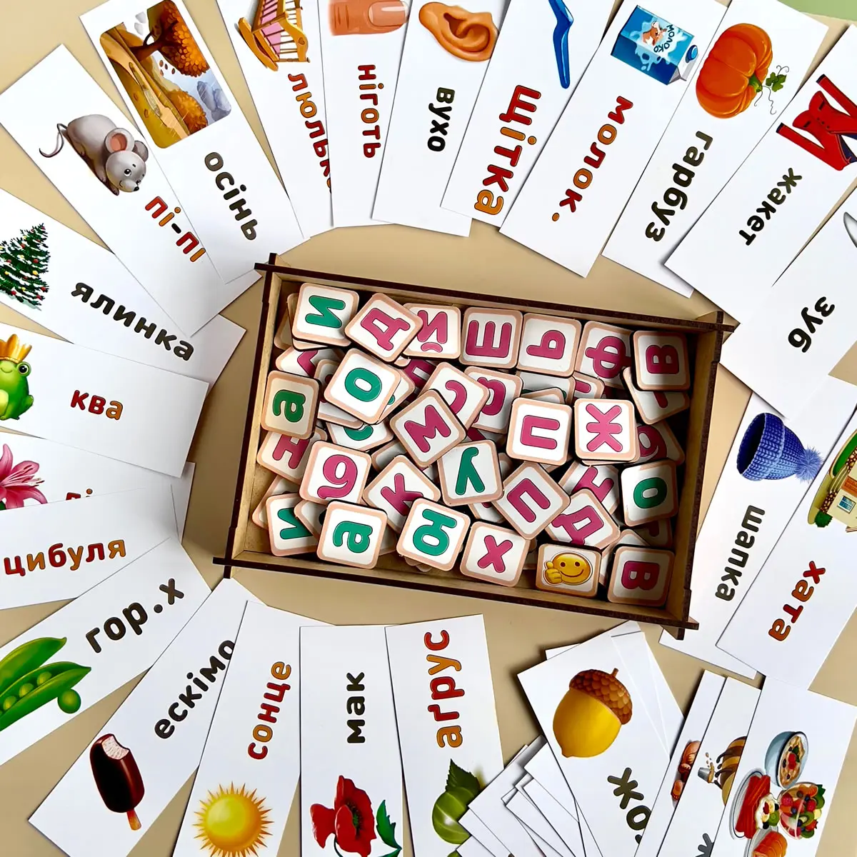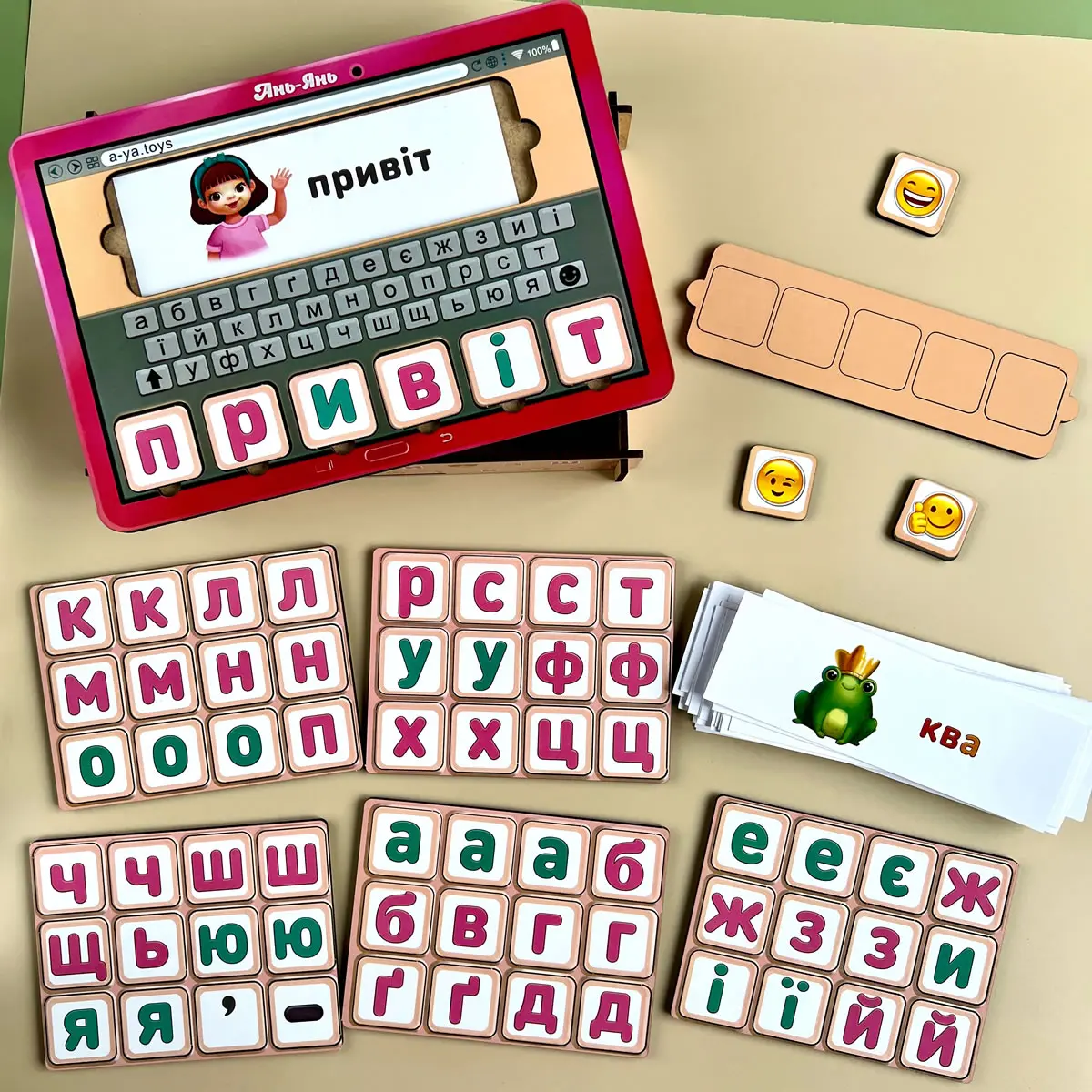 У наборі: основа-планшет, 74 плашки з літерами, 2 плашки-знаки і 84 картки з картинками різної тематики: звуки тварин, пори року, спорт, продукти, частини тіла, рослини, погода і т.д.