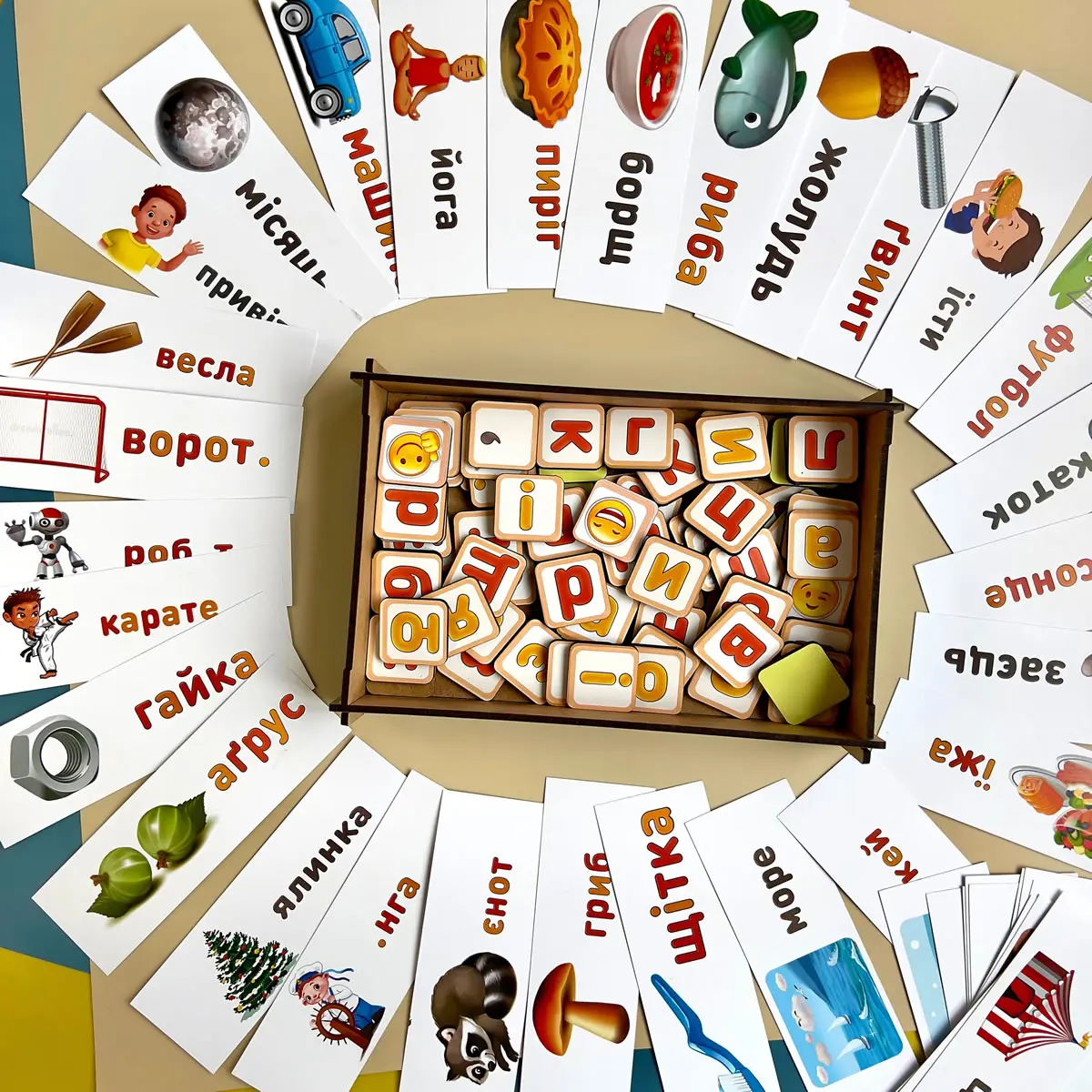 У наборі: основа-планшет, 74 плашки з літерами, 2 плашки-знаки і 84 картки з картинками різної тематики: звуки тварин, пори року, спорт, продукти, частини тіла, рослини, погода і т.д.