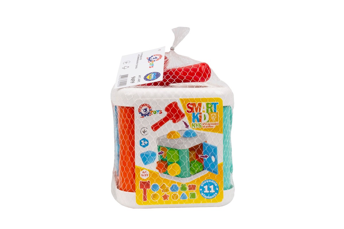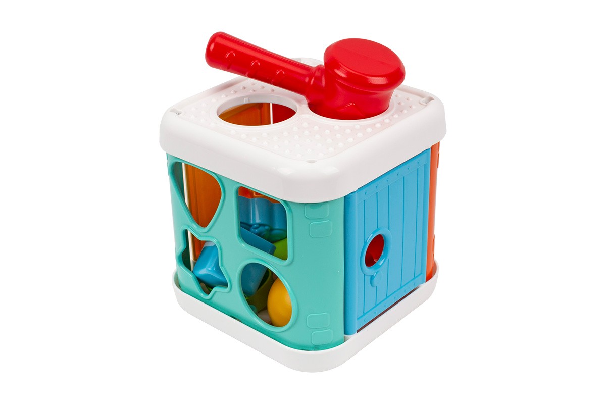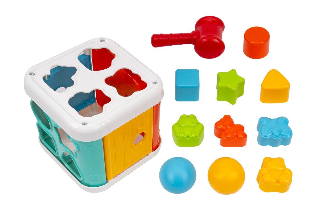Куб має 6 сторін, різного кольору та форми. Дві сторони мають двері, які відкриваються в центр куба, відкриваючи геометричні форми та фігури тварин. Дитина може виймати фігурки і повертати їх у відповідні отвори. На іншій стороні є два отвори, куди дитина може забивати кульки за допомогою молотка. Дитина також може крутити шестерню на одній зі сторін.