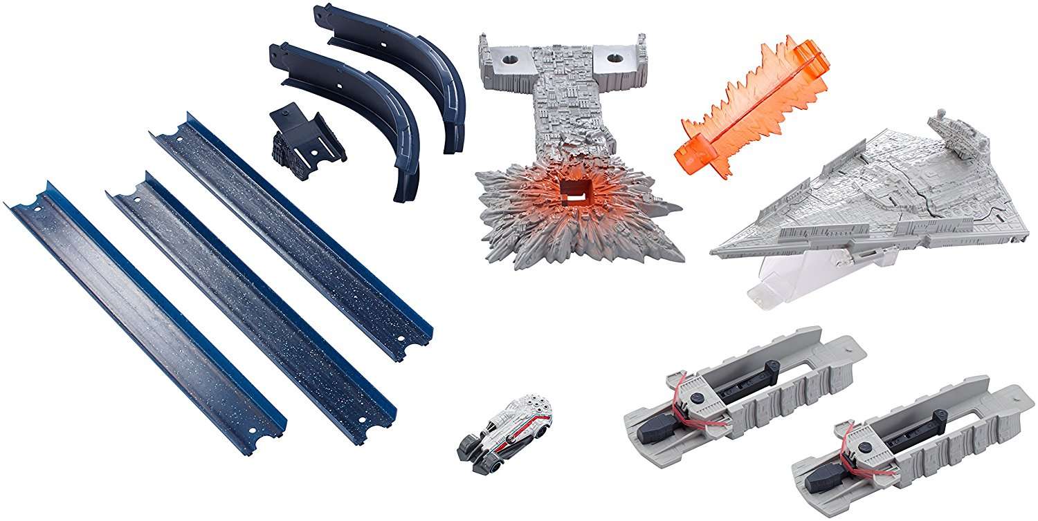 ПодробнееЗвездные войны — одна из наиболее узнаваемых вселенных, повествующая о космосе и межгалактических баталиях, историю этой версии нашего с вами будущего любят как дети, так и взрослые, а армия верных поклонников насчитывает не один миллион. Наш магазин предлагает приобрести фирменную игрушку, качественно стилизованную под корабль главных героев саги — это отличный способ порадовать своего ребенка и себя стильным аксессуаром, а также веселым времяпрепровождением. Трек Хот Вилс Звездные войны Двойной прыжок состоит из нескольких десятков деталей, которые подходят для составляющих других наборов — используя несколько комплектов вы можете создать уникальную трассу, чтобы испытать гоночные модели и посоревноваться с другими гонщиками в мастерстве. Составленная из имеющихся частей конструкция позволяет осуществлять двойной прыжок — это сложный маневр, который необходимо тренировать, чтобы удивить своих соперников.